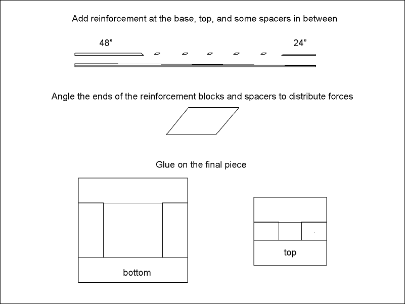 The forces on a mast are mostly lefty-righty, so I have chosen to orient my mast with the wide sticks going lefty-righty, and the smaller sticks going fronty-backy. I taper my reinforcement blocks so they don't end in a hard edge against the smaller sticks.
