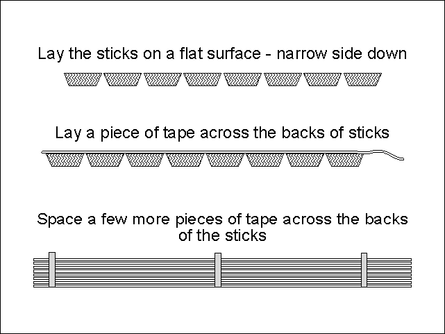 The dangerous part is over. Now it is time to practice assembling the mast. Lay the sticks on a flat surface with the narrow side down. Get them aligned and space them a little, then and lay a few pieces of tape across the backs.