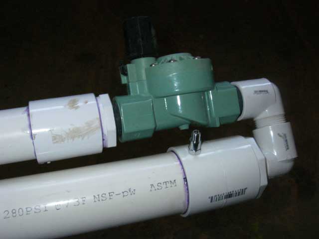 Screw the nipples into the sprinkler valve, the barrel to the EXIT end and the elbow to the ENTER end, then rotate it so the barrel is lined up over the air chamber.