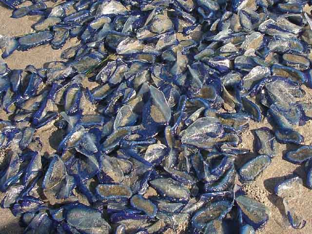 These guys are about 3 inches long and have a fin that sticks up over the water - allowing them to 'sail.' When the spring winds come in from the North West, these babies crash on the beach and die.