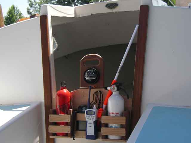 Here it is in place. Small enough to allow me access to the cabin, versatile enough to carry necessary and required equipment, and handy enough to be of use while sailing.