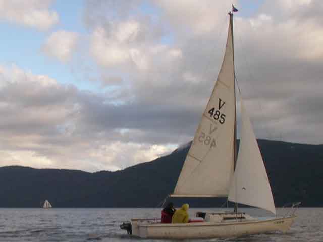 That is a big schooner in the background. The winds had dropped to nearly non-existent so we were motoring along. The schooner was running topsails - a true pyramid of sail.