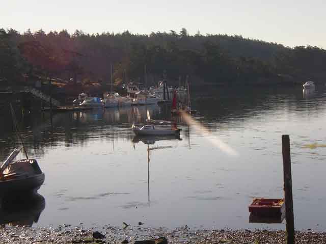 Ron slept in a tent on the beach while I spent a miserable night on the Aurors. I kept worrying about slipping anchor - then when I work up with a start and saw I HAD slipped and bumped up against Chuck's boat, I freaked out. This was about 1:45am, and it was dead quiet. I could even hear snoring from shore. I fired up the outboard and got way from Chuck's boat and repositioned my anchor. This is how it looked the next morning. |