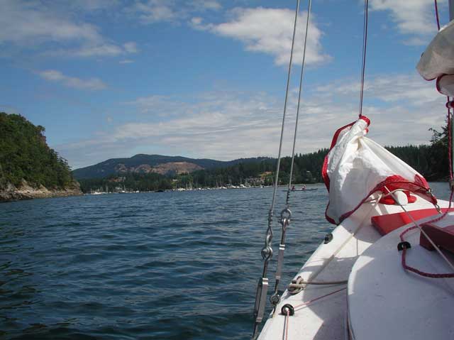 At the end of the channel, the wind ran out so we hauled in sail and motored to Deer Harbor.
