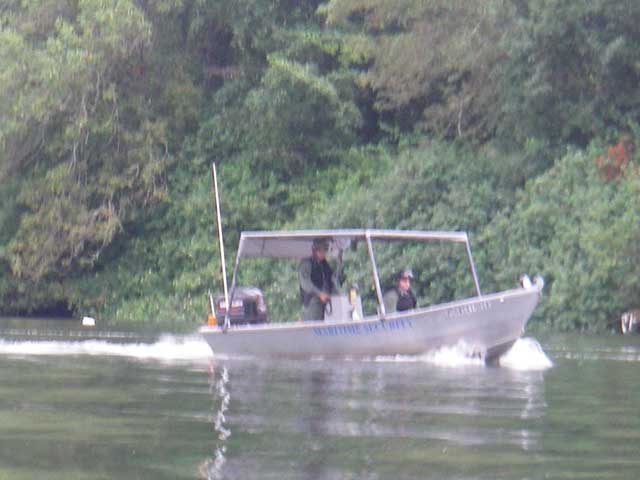 These jokers are "marine security" for the LST. They play at dress up and chase people away from the boat. They are volunteers trying to keep thieves and thrill seekers off until the Coast Guard can take this boat out and either break it or sink it. (that's what I heard) |