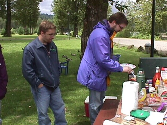 The lure of snatching live eels from the boiling waters of the Willamette Falls was not confined to old friends and Intel buddies. Casey Feskens and John Calahan, Willamete University Network Administrators were caught up in the excitement as well. They joined us for lunch. |