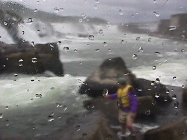 That's me. We took the marina owner's advice and wore out lifejackets the whole time. That spray on the lens is a mild indicator of the amount of water that was in the air and on the rocks. We did see a HUGE fish in that pool I am looking at.