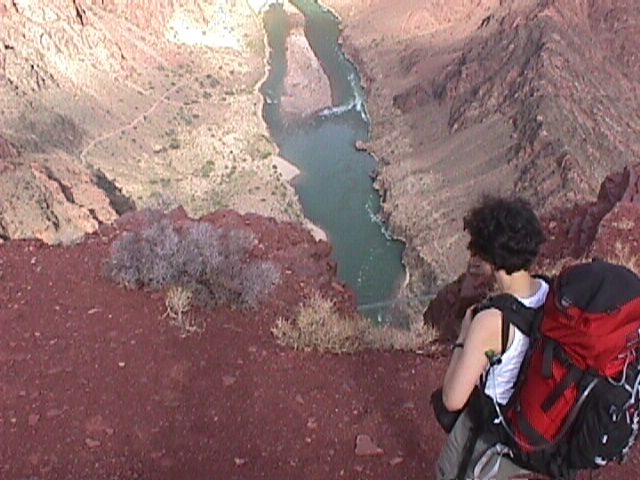 Ohh, look at the pretty river so far below us. That bridge just past Keely is one of the two that span the Colorado down there, and both lead into the camp. It was about here I noticed a twinge in my knee every time I lifted my leg to take another step. It was about 8:30 or 9:00am and starting to warm up. |