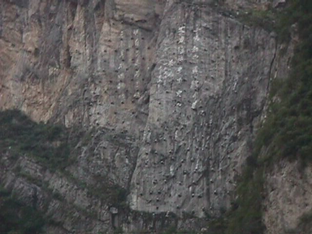 Click on this picture so you can see it at full size. Those are iron bars driven through the rock to hold it to the mountain behind. This particular rock threatens to break off and if it does, it will nearly block the gorge. That is one heck of a lot of work to go though, but the Chinese aren't fools. I am sure it is the best solution available. |