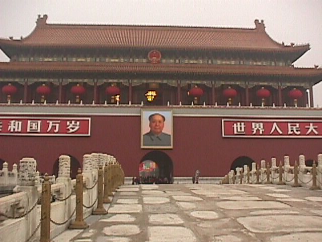 The bridges lead to the southern entrance to the Imperial City, The Gate of Heavenly Peace (Tian An Men). These places are built on a North - South axis for good Feng Shue. The main enterance is to the south because good things come from the south, like food and tribute from the rich southern provinces. Exits are to the north because bad things come from the north, like Mongols and Manchurians. |