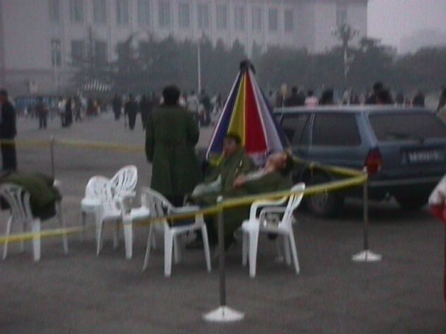 After the flag raising, we wandered around waiting for the Forbidden City to open up. I wish this picture had come out, there is one guard stretched out sleeping with his mouth hanging open and his coat unbuttoned. Since I had only been in country a few hours I wasn't sure about the protocols for taking humorous photos, so I just snapped this and hurried on. |