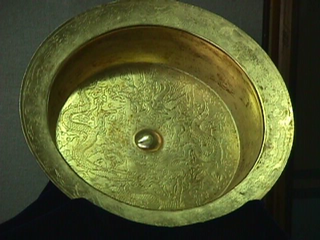 Gold bowl (I think I remember that gold was considered less valuable than silver) with Dragons chasing a Pearl motif. Pearls are one of the 8 precious stones in Chinese mythology, lots of good stuff about pearls.