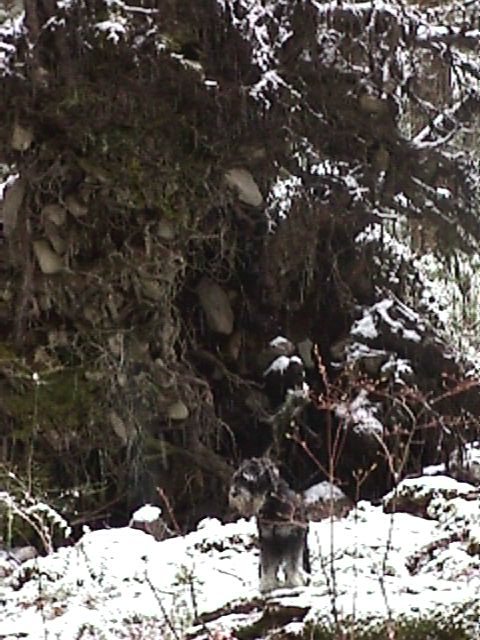 Boadicea against the root of a felled tree, surrounded by a light dusting of snow. I was feeling artsy that day.