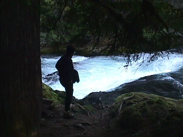 Keely by the rushing waters of the McKinzie after it comes out of Clear Lake and over Sahalie Falls.