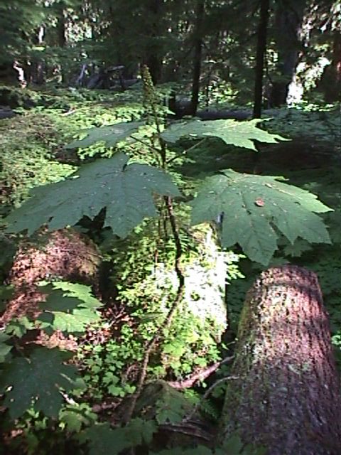 | We were puzzled by this plant. I looked it up and found out it is one of the really important ones, all kinds of uses from fish hooks to rheumatism medicine. It is called Oplopanax Horridus (Devil's Club - (because of the thorns, probably) . If you want to read more about it, click here. | |