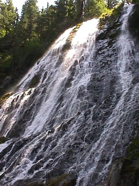 (Diamond Falls from the bottom). Soon after the one guy left for Boise, Diamond's crew got bored and quit building the road. The wagon train, 1500 people strong, ran out of water crossing Central Oregon and lost all their livestock. When they hit the forest in the Cascade foothills, they were starving. There was no road and winter was coming so they abandoned their wagons and ran for it. |