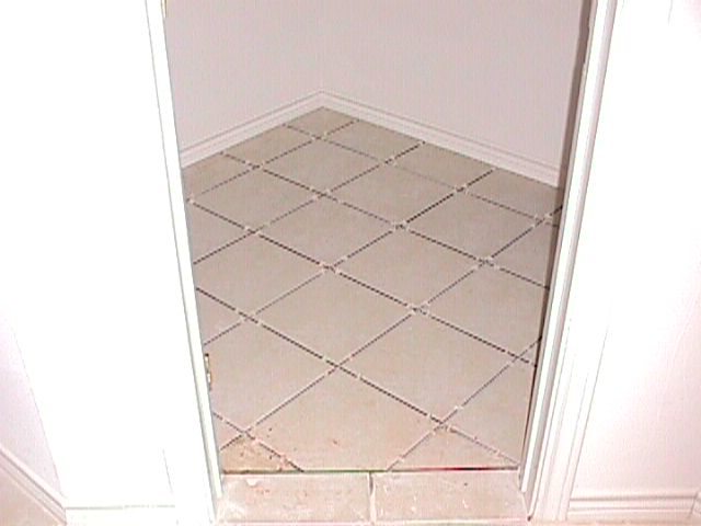 I progressed up the entire spectrum of tile laying, from hauler to cutter to mudder to layout. This is Steve's closet, which I laid out all by myself. I wanted to do Steve's closet so every day, when he goes in to get his clothes, he will step on the tile and remember. |