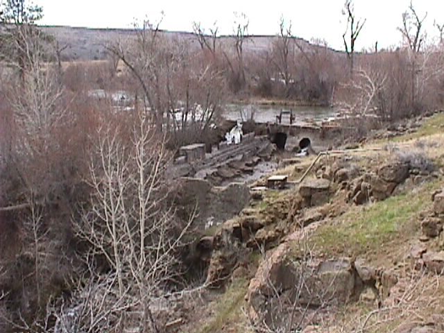 The concrete works are the dam that backed up the river before the falls. In times of excess water, it just spilled over the dam an then over the falls. The stored water ran through that pipe in the center right and then through a 3 foot diameter pipe down to the power plant - about 300 yards away and 40 feet lower. |