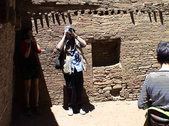 Look carefully above their heads on the left. Those log stumps used to go across the room and were the rafters. Those smaller logs over Jim's head also crossed the room, perpendicular to the larger logs. Then they were covered with layers of clay and juniper bark and made the floor for the room above. |