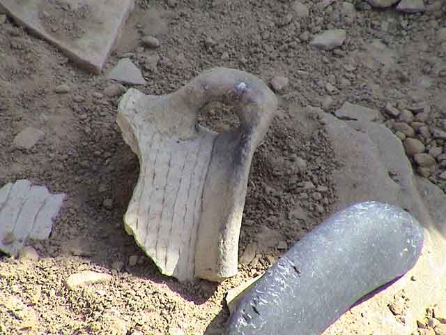 This is another corrugated utility pot, possible a canteen intended to be carried on a rope. Pot technology really enabled the Puebloan society to take off in the 700s. They could store food better, they could cook food more efficiently, and they made excellent trade goods. Once they had too much stuff to carry, they needed a place to live, so they started building pit houses and learning agriculture. |