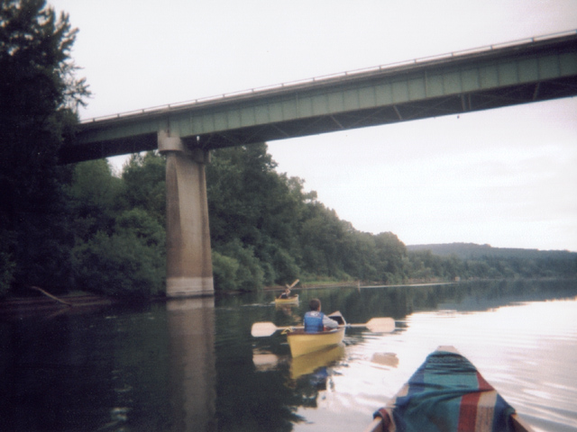 out. If we had really been at Champoeg, we would only have 18 miles left to cover, better than the 24 I had anticipated. After hours of paddling (most of it with Ryan playing Pilot Fish to my canoe's Shark) I saw this bridge and thought it was I-5. As we approached, I realized it was actually Highway 219, MILES upriver from I-5, and even worse, miles upriver from Champoeg. Who told me it was Champoeg? Ken, grandfather of the "special" Joshua who had led us astray on campsites the night before. Those two had to be agents of the devil placed in our paths to make us suffer. Eventually, we oozed our way northward to a more populated area and came across a fisherman who, after admiring our hand built canoes, pointed us to the landing at Champoeg at river mile 45. We hadn't seen a river mile sign since mile 69 (which would have been childishly amusing if we hadn't been so g*ddamned tired.) I gave up. I knew there was no way any of us could cover an additional 18