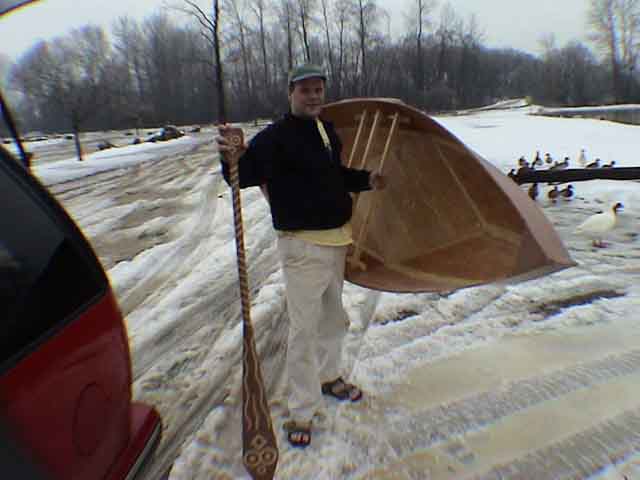 There were some other modifications as well. I had to move the seat forward a bit, and I added a center support beam for the seat to hold up my bulk. Even with this, the canoe only weighs 23lbs (verified on the Weight-o-Matic). Notice my cool war paddle? That baby cost a whopping $1.50 to make. |