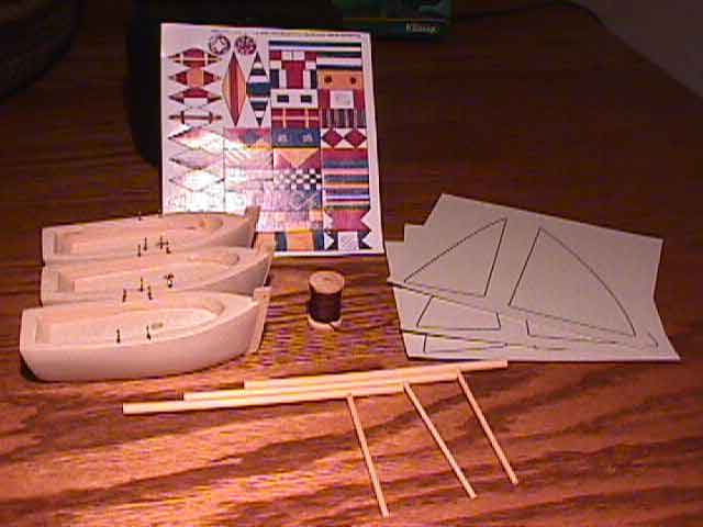 Parts: 3 hulls, 3 masts, 3 patterns for sails, a spool of thread for the rigging and some flag stickers.