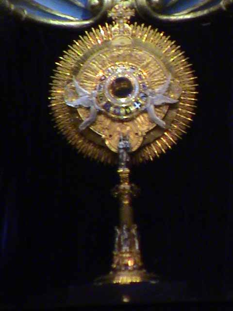 That thing in the middle of the alter is called something that sounds like "Monster" and it is the item that turns ordinary wafers and wine into the flesh and blood of Christ, allowing Catholics to practice cannibalism without actually killing people. It was made out of donated jewelry and to get it insured, it has to be kept in a vault. To make it visible and usable for transmogrifying, the alter was specially designed: the Monster lives behind 2inch thick bullet proof glass and there is a mechanism that raises and lowers it for the priests. The whole thing is set up on timers and key-codes and is very much like a bank vault. |