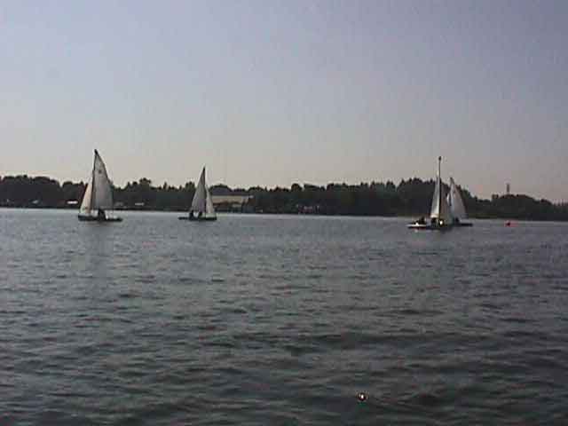 This is our armada. On this day of sail, we had 5 boats - Linda and I, Steve and Linda - a married couple from Alaska, Gila (a kayaker entering the world of sail) and Valerie (my Linda's friend), Kamal (lives near the sailing club, was interested in learning) and Katherine (didn't really talk to her), and a father and son team from another class. |