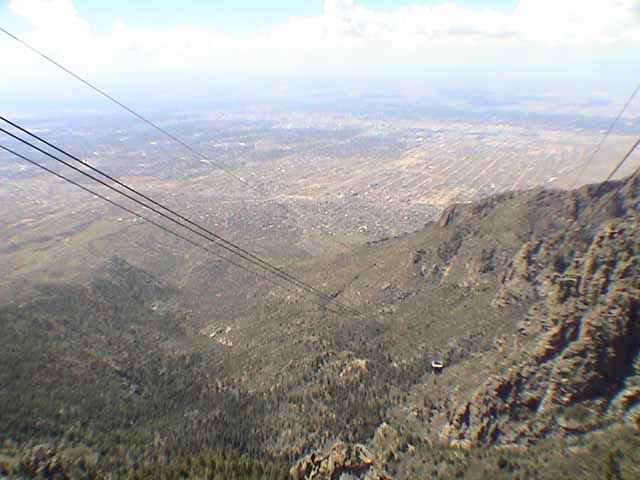 A view down to Albuquerque. When we got down, we tried to drive the Turquoise Trail, which would have taken us from Albuquerque back up to Santa Fe. About 30 miles into it, we came to a road block and were turned around because there was had been a fatal motorcycle accident. They don't have helmet laws in New Mexico. |