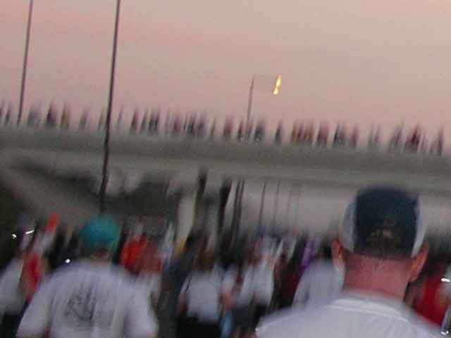 Sorry for the focus. My camera does not take pictures quickly and often blurs motion shots. I am trying to show the crowds of people, including those ahead of us who were crossing over the overpass. As this was Florida, the overpasses were the only 'hills' on the course. Everything else was dead flat. |