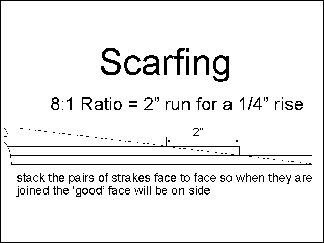 (click on the pic to get the full size) Step 1 was to make the boards I cut from an 8 foot sheet of plywood into 16 foot strakes. For this you must 'scarf' the ends and glue them together. There is another method called a butt-joint, but it is less elegant. It was about here that I noticed I hadn't brought along the boards that make the keel (I pre-cut all the pieces at home while I was planning this trip), and it was too late to buy another sheet of plywood locally. I decided to scarf what I had and do the keel the next day. |
