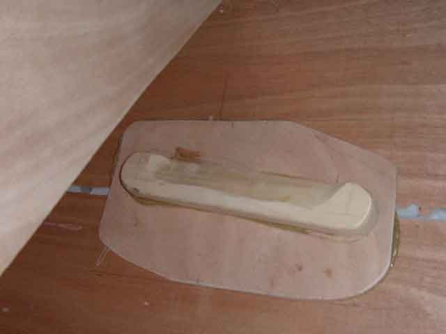 Next, I needed to install some support for where the seats connect to the hull. With such thin walls, you need to distribute the force of having someone's big butt in the seat. I made a guess at here the seats should go and glued and screwed these brackets to hold the seat. Notice I purposely put this brace over the chine (seam between two boards - called strakes in boat builder lingo). |