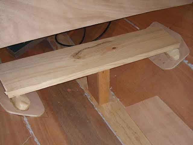 And there you have the seat - a 1x6 cut to fit, supported by brackets on the ends and a 2x4 post to transfer the weight through the bottom of the boat to the keel. None of these are attached yet, because I still need to sand and paint.