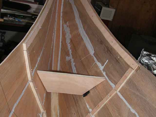 This boat is made out of 5.2mm Luan, which is pretty flimsy stuff. I decided to put in bulkheads at the bow and stern. I needed to run some frames along the inside of the hull to give me something to glue the bulkheads and decking to. These are just scrap pieces of plywood. |