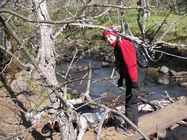 Kind people had made a bridge over the creek from plywood and lodgepole pine. After an initial scare, the dogs were more than happy to trot across.