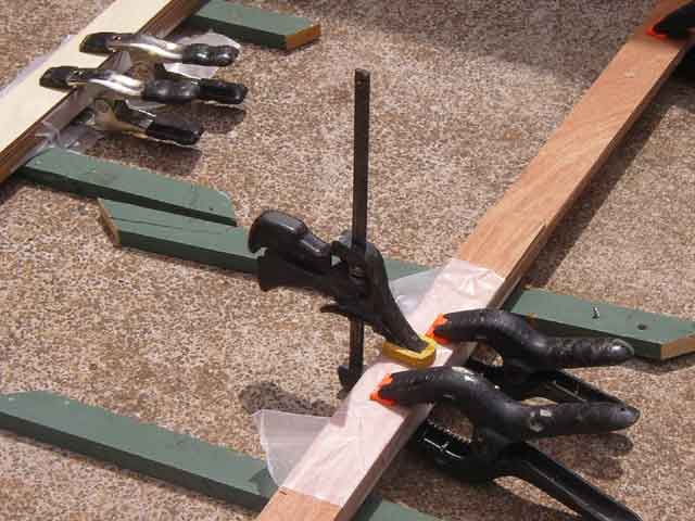 I then glued and clamped the joints together - I used Elmer's Ultimate glue for this (this is a cheaper version of Gorilla Glue). I staggered the joints on alternating layers of the keel - first using an 8ft piece for the center, then a 6ft center piece for the next layer. |