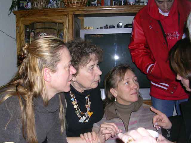 Cousin Lynn, Mom, and Andrea are paying close attention to something Steve's wife, Theresa, is saying. That's Cody in the background.