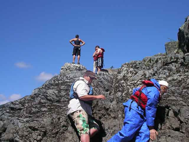 We were at Blossom Bar, the most wicked death rapids on the river. Old women weep just thinking about them. We needed to get out and scout the rapids, so we climbed up the rocks. Greg liked to make sure we hit all the rough water, so Pete, the other passenger in our raft, had donned his poly-wet suit. He was not amused when I called them his 'waterproof Depends.' (by the way, that is a darn good photo) |