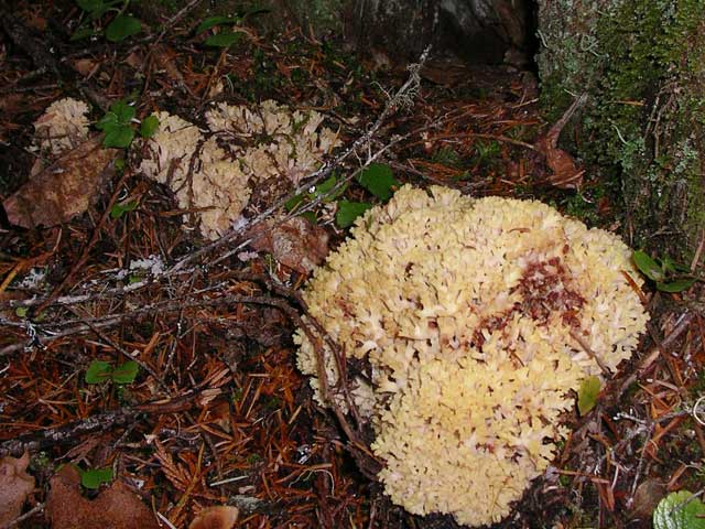 I don't do mushrooms. I mean I eat 'em from the store, but I don't know 'em well enough to harvest them in the wild. I *believe* this is a Chanterelle. It is bigger than my closed fists and when I was a kid, we called 'em Brain Mushrooms and threw them at each other. |