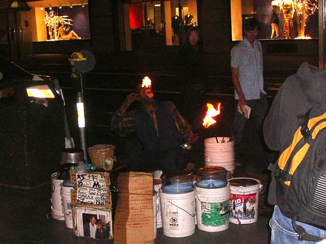 I spent the rest of Sunday with my buddy, Larry and we took in the sights of Half Moon Bay and Pacifica. Larry and Pam brought me back to downtown where we met up with Keely and had an outstanding dinner at a Pakistani/Indian place. On the way back, we saw this guy doing percussion music on water bottles with flaming drumsticks. |