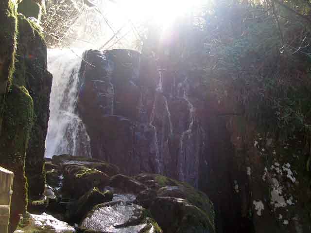 The trail ends at Sweetwater Falls. Above the falls, we could see and hear a logging helicopter. Logging by helicopter is less intrusive than logging by truck, but I wonder that will happen to Sweetwater Creek if they clearcut above the falls. Still, people need stripmalls and McMansions, I guess. Progress. Ever progress. |