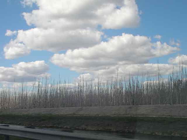 When I saw this patch of bare trees, I thought maybe they were dead - possibly from 'getting salted' from a hurricane - that's when the storm pushes seawater into places that are normally freshwater. Later., I learned the Bald Cypress (Taxodium distichum) is a conifer that sheds its needles in the winter. Perhaps this was a stand of Bald Cypress. |