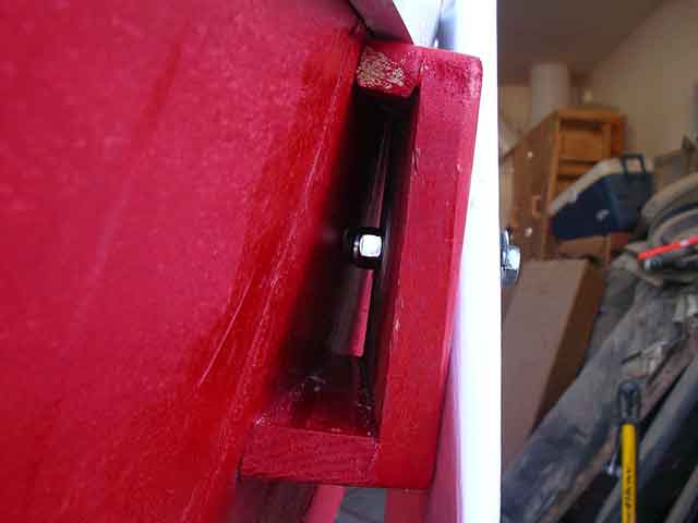 The leeboard swings forward and back so I can beach the boat. I attach the leeboard to the mount with a 3/8 bolt screwed into a lock nut. The leeboard is supposed to be held in place by friction - we'll see.
