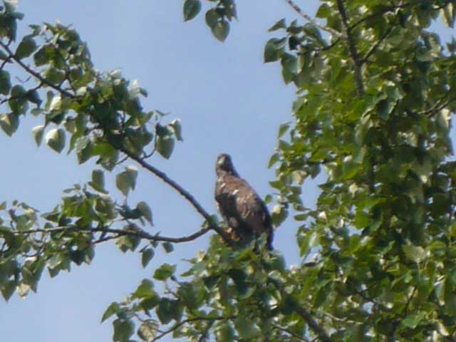 This is an immature bald eagle. There had been another, mature eagle in the tree, but it flew off as we approached.