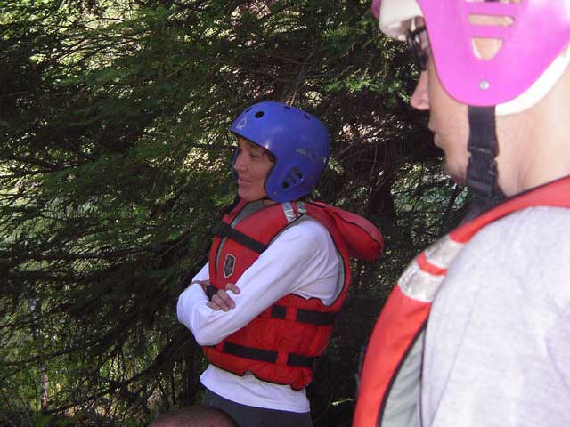 This was in mid-August, and the river seemed pretty low - hence the headgear. Keely was intently listening to the orientation.