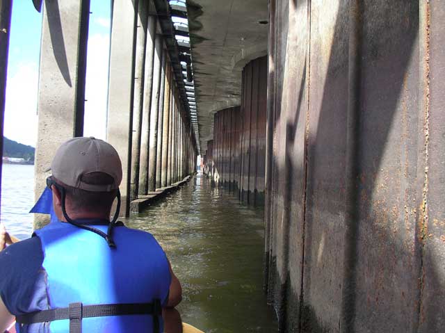 This was out last pier. It was different in that it was held up by the huge, circular pilings you see on the right. The outer pilings had creosote bracings at water level - like railroad ties - with big, nasty bolts sticking out about 10 inches. We had to be real careful not to get too close to those as we were still about 5 miles from the pull-out point and didn't want to hull the boat. |