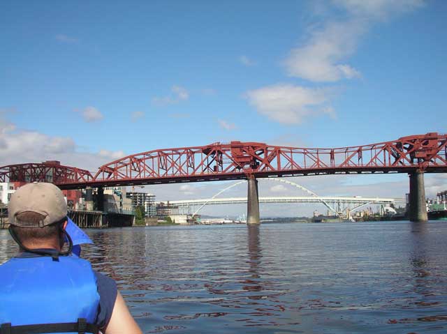 That rusty one is the Broadway Bridge, the big white one is the Fremont - I-405 goes over it. I pedaled my bike over all of them once, but never paddled under them until now.