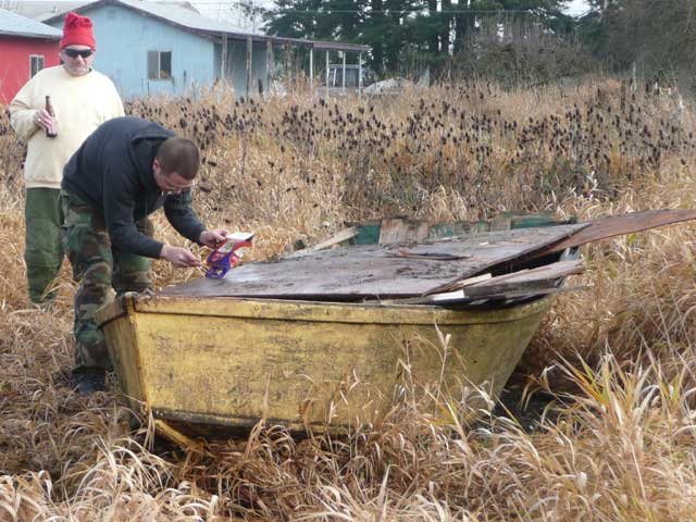 Man, this was one tough boat to light. The air had 98% humidity, it was 37 degrees, the ground was a bog, and all we had for paper was the cardboard carrier for the six-pack of beer.