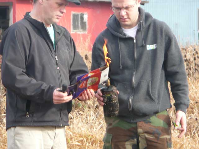 Finally, we found a propane canister that had a puff or two of gas in it, got it lit, and touched it to the gasoline soaked the six-pack carrier.